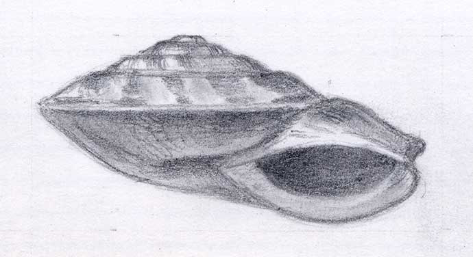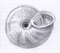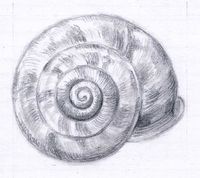 linsenförmig flach mit einem deutlichen Kiel an der äussersten Windung; graubraun bis rötlich, mit dunkleren Flecken