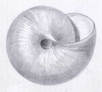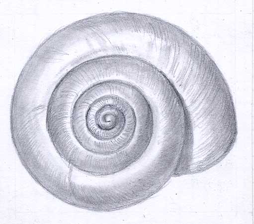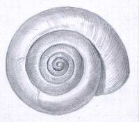 kugelförmig, einfarbig weiss oder schwach gelb; bei lebenden Tieren intensiv gelb; selten bräunlich; leicht durchscheinend, manchmal mit schwachem braunem Seitenband; Nabel tief und offen