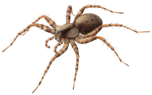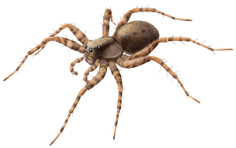 Die Wolfspinnen bauen keine Netze, sondern sie sind frei jagende Räuber. Sie besitzen daher gut entwickelte Augen, die in drei Querreihen angeordnet sind: Am Stirnrand liegen vier kleine Augen dicht nebeneinander, dahinter vier deutlich gössere in einem nach hinten erweiterten Trapez. Die Weibchen tragen ihren Eikokon an den Spinnwarzen. Die Jungspinnen werden später auf dem Hinterleib getragen. Bei uns kommen etwa 70 Arten vor, die zum Teil nur sehr schwer zu unterscheiden sind. Im Schulgelände ist vor allem die Gartenwolfspinne häufig: