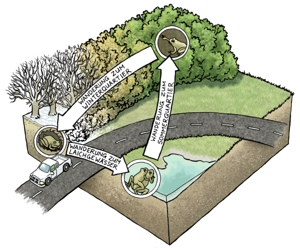 Amphibien legen grosse Strecken zurück. Im Frühling wandern sie vom Winterquartier zum Laichgewässer. Nach Paarung und Eiablage wandern sie zum Sommerquartier, wo sie sich ausruhen und fressen. Im Herbst verlassen sie das Sommerquartier und suchen sich frostsichere Plätze wie Erdlöcher oder Baumstrünke.