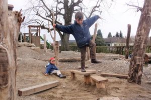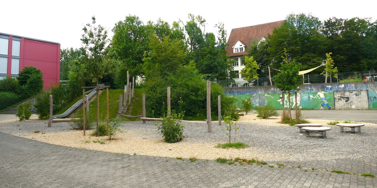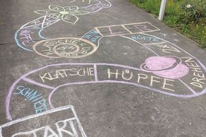 Kreativer, fächerübergreifender und bewegter Unterricht lässt sich auch auf einem asphaltierten Pausenplatz in einem gewissen Mass umsetzen: Rasch sind auf dem Boden Linien mit Kreide für Spiele wie Himmel und Hölle gemalt. Später könnte daraus mit Acrylfarbe gar bleibende Kunstwerk entstehen. Die Linien und Spiele bieten in den Pausen Abwechslung und helfen, das Gleichgewicht zu trainieren oder in Bewegung zu lernen, etwa Vokabeln oder das 1×1.